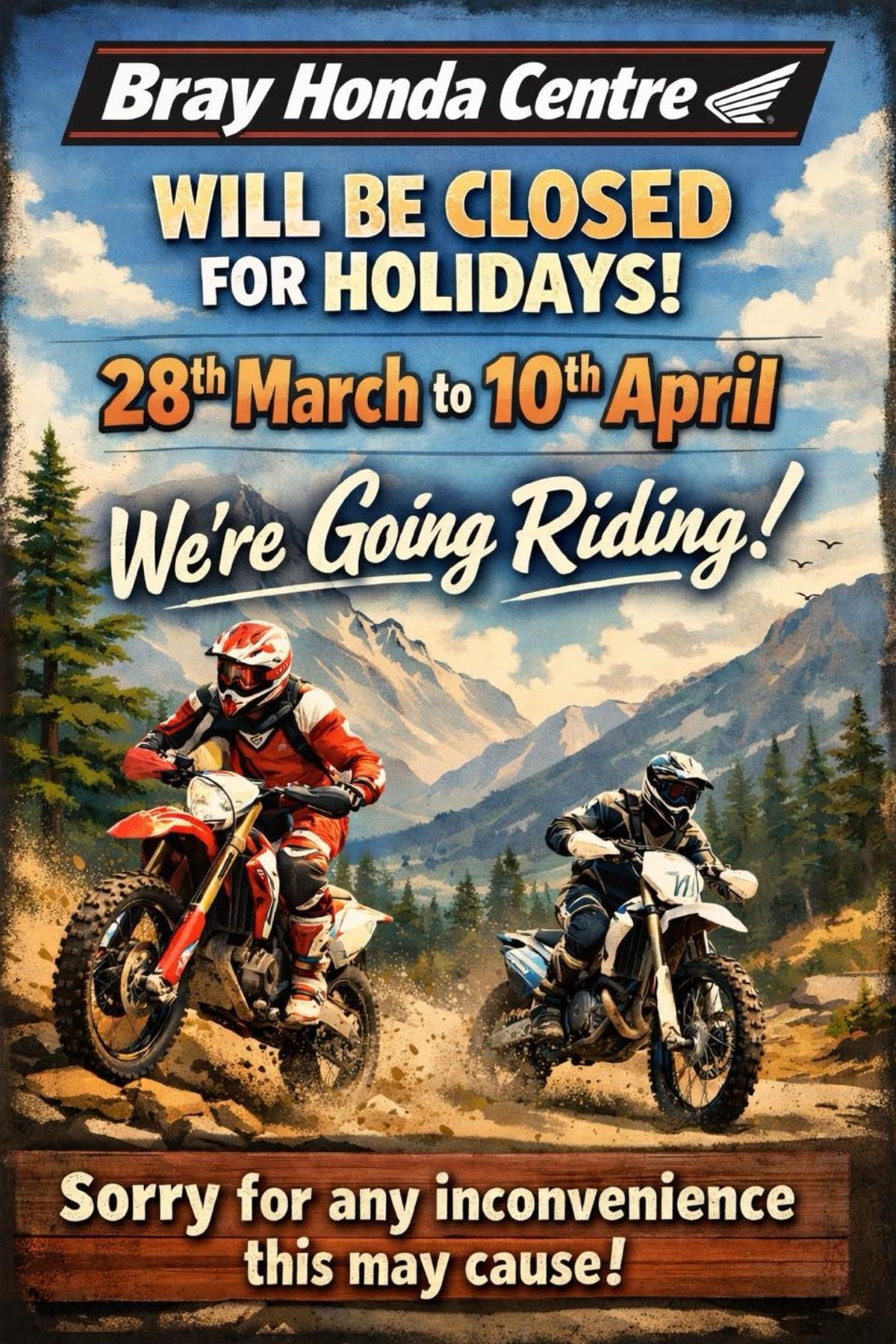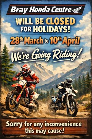 Bray Honda centre will be closed for holidays from the 28th March to the 10th April.
